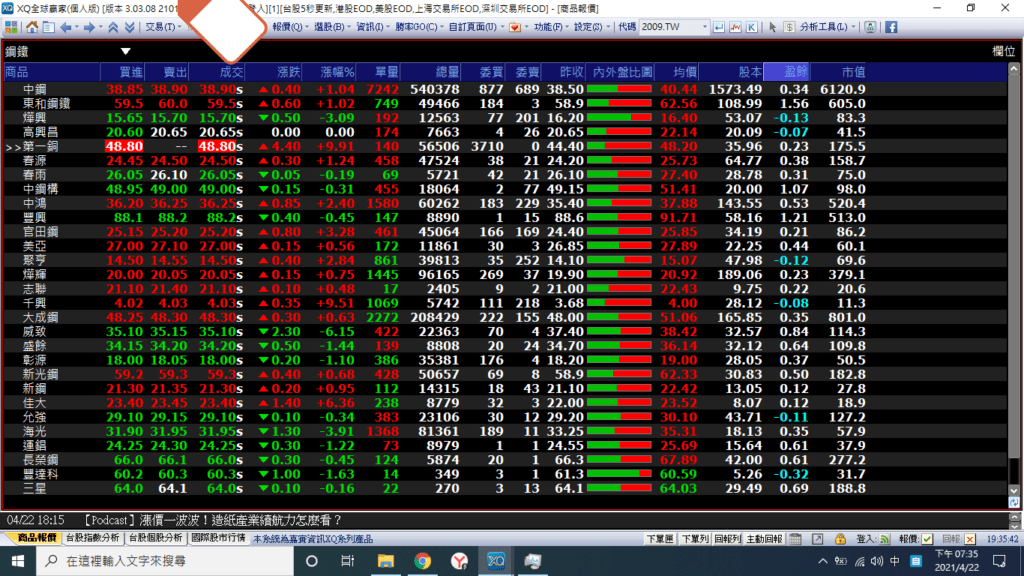 看首頁圖就知道,即使今天大盤開高走低,爆大量,高低點差了快400點,鋼鐵類股,還是收紅的比較多。