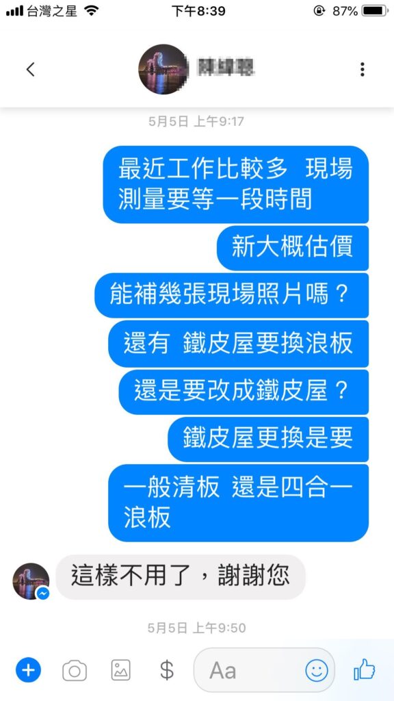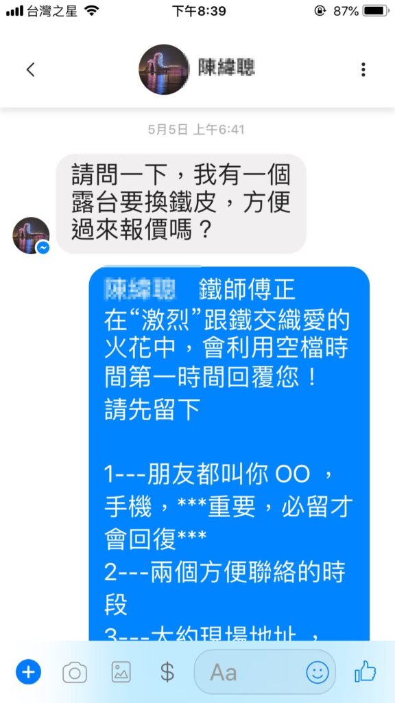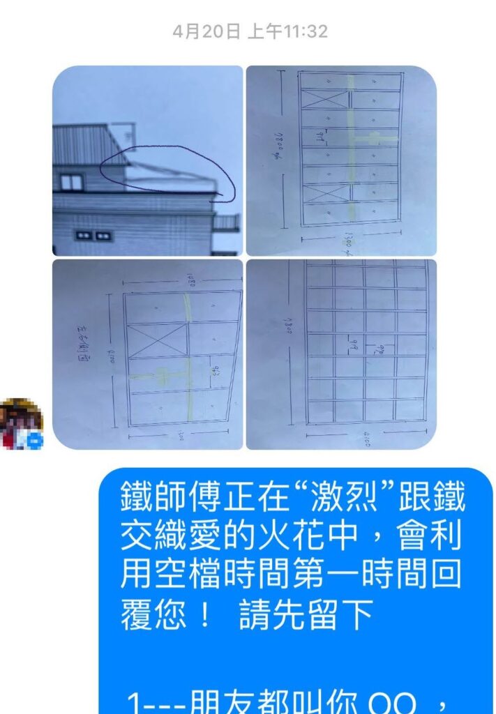 這種就有大概行情價可以參考,真的是沒有時間過去現場,鐵師傅主要還是需要交件,才有錢賺,去估價,也要等工作空檔,有些客戶比較心急的,就沒緣當朋友。