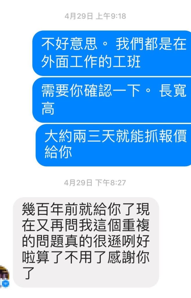 網路報價,可能需要個三天到一週,如果要跑南部地區,需要現場測量的話,時間可能會更久一點,要等工作空檔才有空。